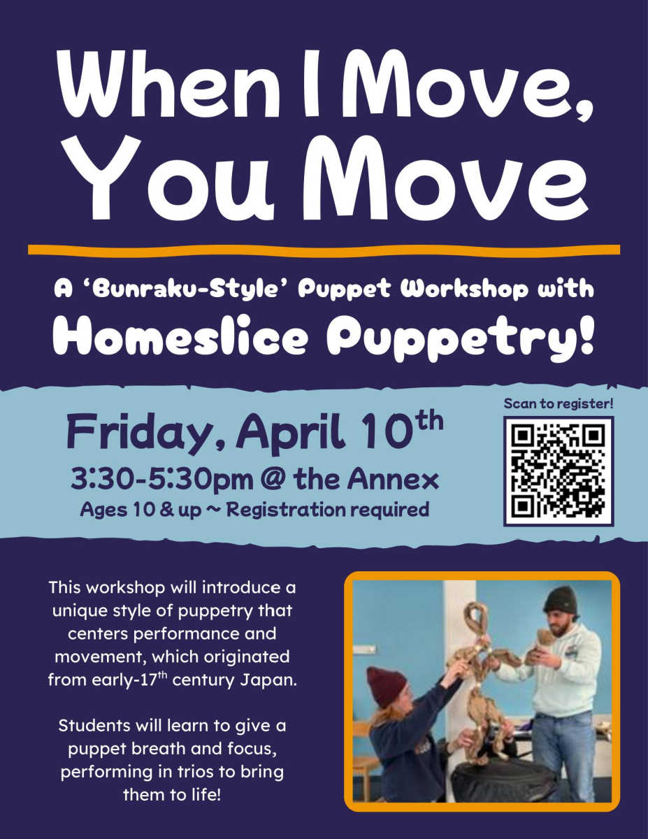 Bunraku puppets are large, highly detailed traditional puppets used in Japanese puppet theater. This art form dates back to the 17th century and is considered one of Japan’s most refined theatrical traditions. In Bunraku, the puppeteers wear black and stand in plain sight, but after a while, you hardly notice them. This visual metaphor can awaken the realization that our lives are also animated by unseen forces. Even though you see the puppeteers, your brain quickly forgets them. In this workshop, participants ages 10+ will learn a bit about Bunraku puppets, use simple materials to build their own, and perform them with others. – Registration required.