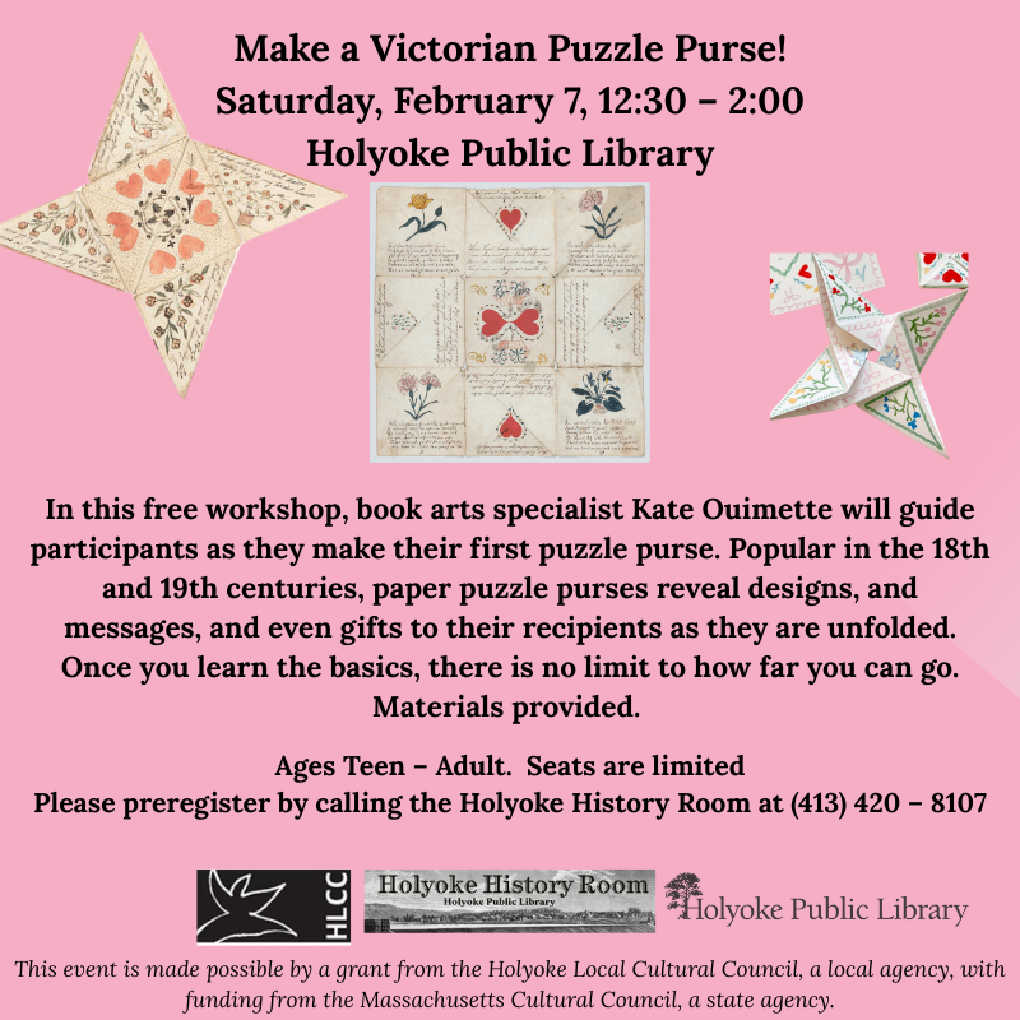 Paper folding becomes a window into 19th-century creativity through the tradition of the Victorian puzzle purse, a playful object popular in the mid-1800s. This hands-on workshop explores how geometry and symmetry shape folded forms that reveal messages as they open. Guided by book arts specialist Kate Quimette, participants learn the basic structure before experimenting with words and images. – Recommended for teens and adults. Seats are limited. Pre-register: 413-420-8107
